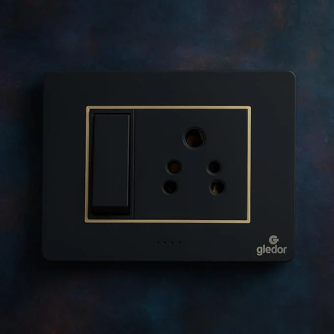 with SEER switch plate Black Modular Switch and Socket Combo, 16A Switch with 6/16A 3-Pin Socket, Gold Trim