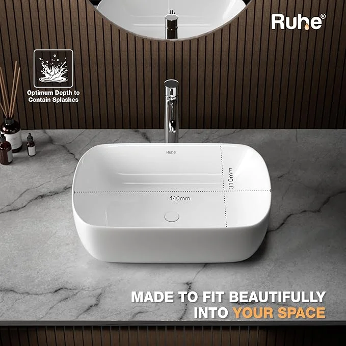 with Ruhe® 18x13x5 Inches Norma Table-Top Wash Basin White Ceramic Counter Top Wash Basin With Curved Corner Design & Glossy Finish, Modern Bathroom Sink For Home, Hotel, Office