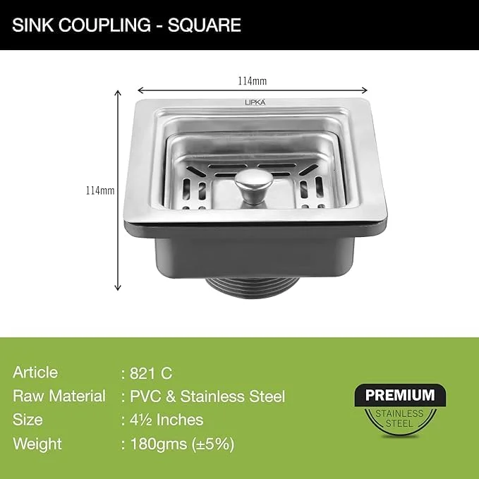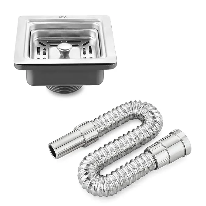 LIPKA Sink Coupling & Waste Pipe Set – 4.5-Inch Stainless Steel Square Drain Coupler with 30-Inch Stretchable PVC Outlet Pipe | Rust-Free, Durable Drain Set for Kitchen & Bathroom Basin