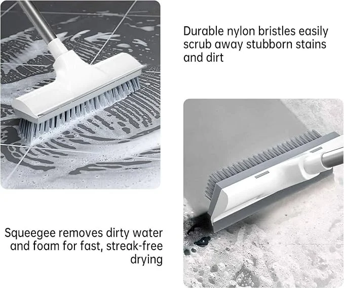 ?2 in 1 Floor Scrub Brush?- This is a magic broom brush comes in 2 in 1 function that is floor scrub brush and scrape. Floor Scrubber with Squeegee. its stiff bristles is used for scrubing the floor, after brushing the floor, you can easily scrape off the sewage with the rubber squeegee.