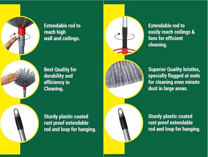 Telescopic Rod: The key feature of this tool is its telescopic or extendable rod. The telescopic design allows you to adjust the length of the handle to reach various heights and angles. This is especially useful for cleaning high ceilings, light fixtures, or tall corners without the need for a ladder.